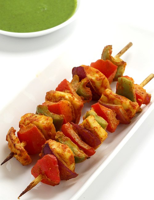 An assorted platter of paneer delights, lightly spiced, grilled, and served with dips and salad